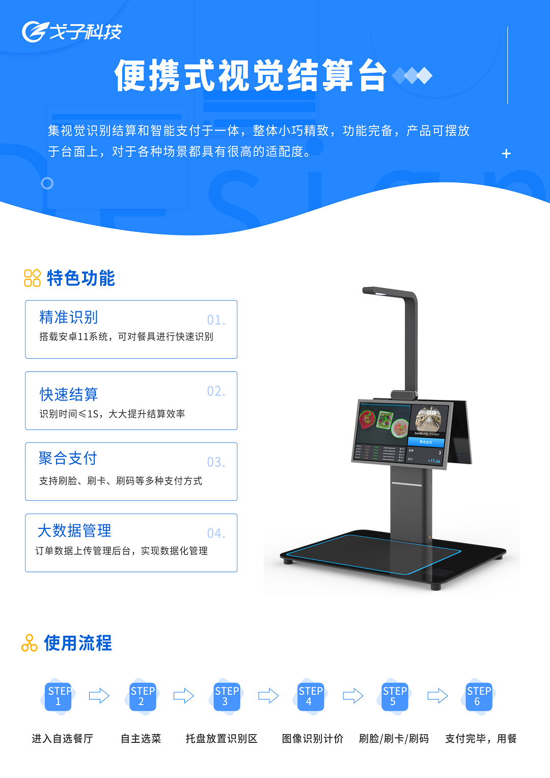 戈子科技视觉结算台,是一款依托图像识别技术用于团膳领域实现智能结算的创新型设备,能够根据餐具的大小、形状、颜色快速智能识别 “结算区”中的餐具、产品图像并智能精准结算,并连接一卡通等第三方支付系统,让就餐者快速完成支付,减少排队时间。