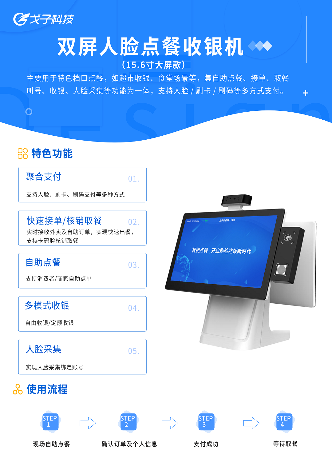 双屏人脸点餐收银机(大屏款)主要用于特色档口点餐,如超市收银、食堂场景等,集自助点餐、接单、取餐叫号、收银、人脸采集等功能为一体,支持刷脸/刷卡/刷码等多方式支付。设备配备15.6寸双触屏高清显示屏,操作更加简单便捷。
