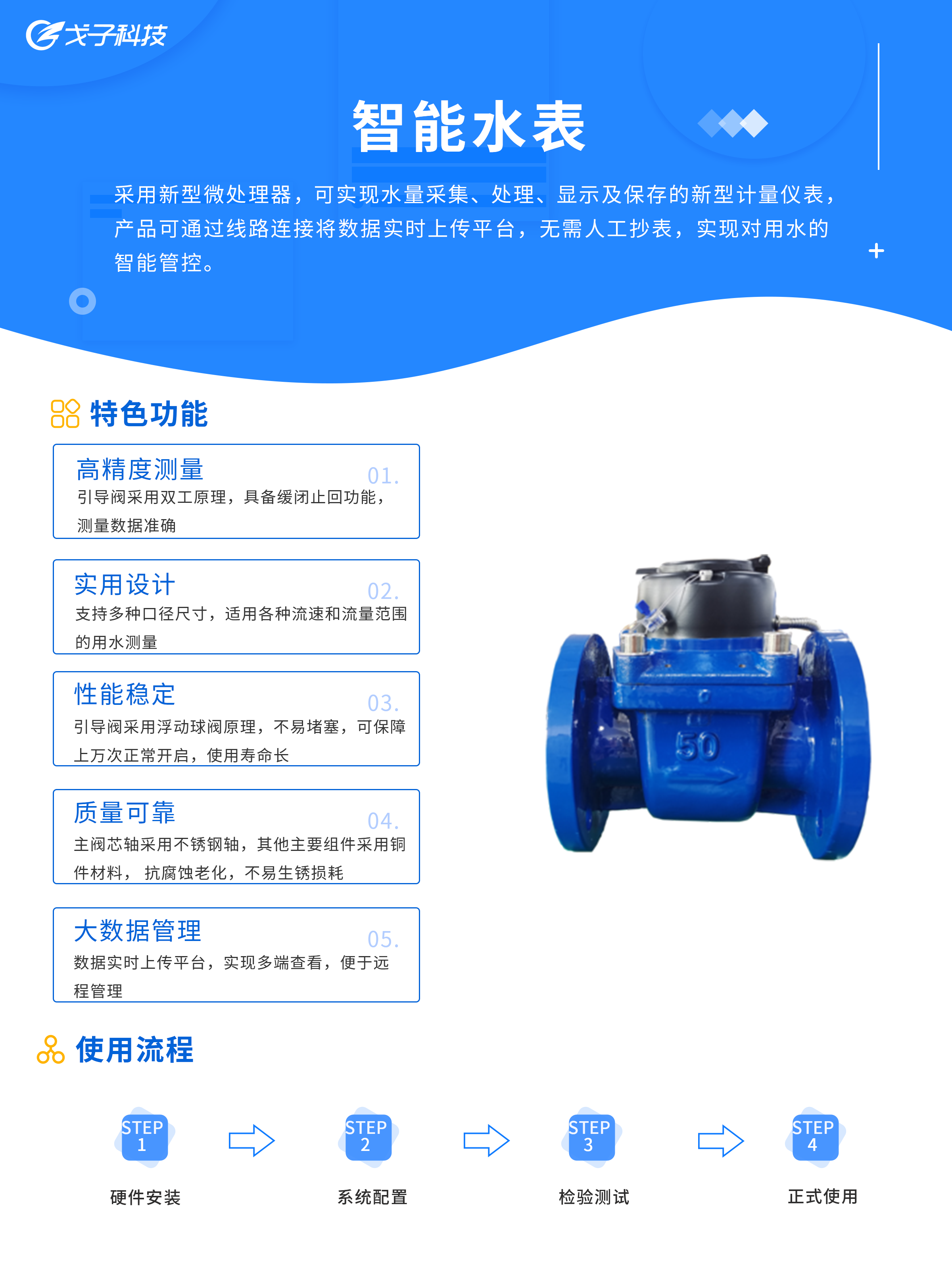 戈子科技智能水表采用新型微处理器,是可实现水量采集、处理、显示及保存的新型计量仪表,产品可将数据实时上传平台,无需人工抄表,实现对用水的智能管控。