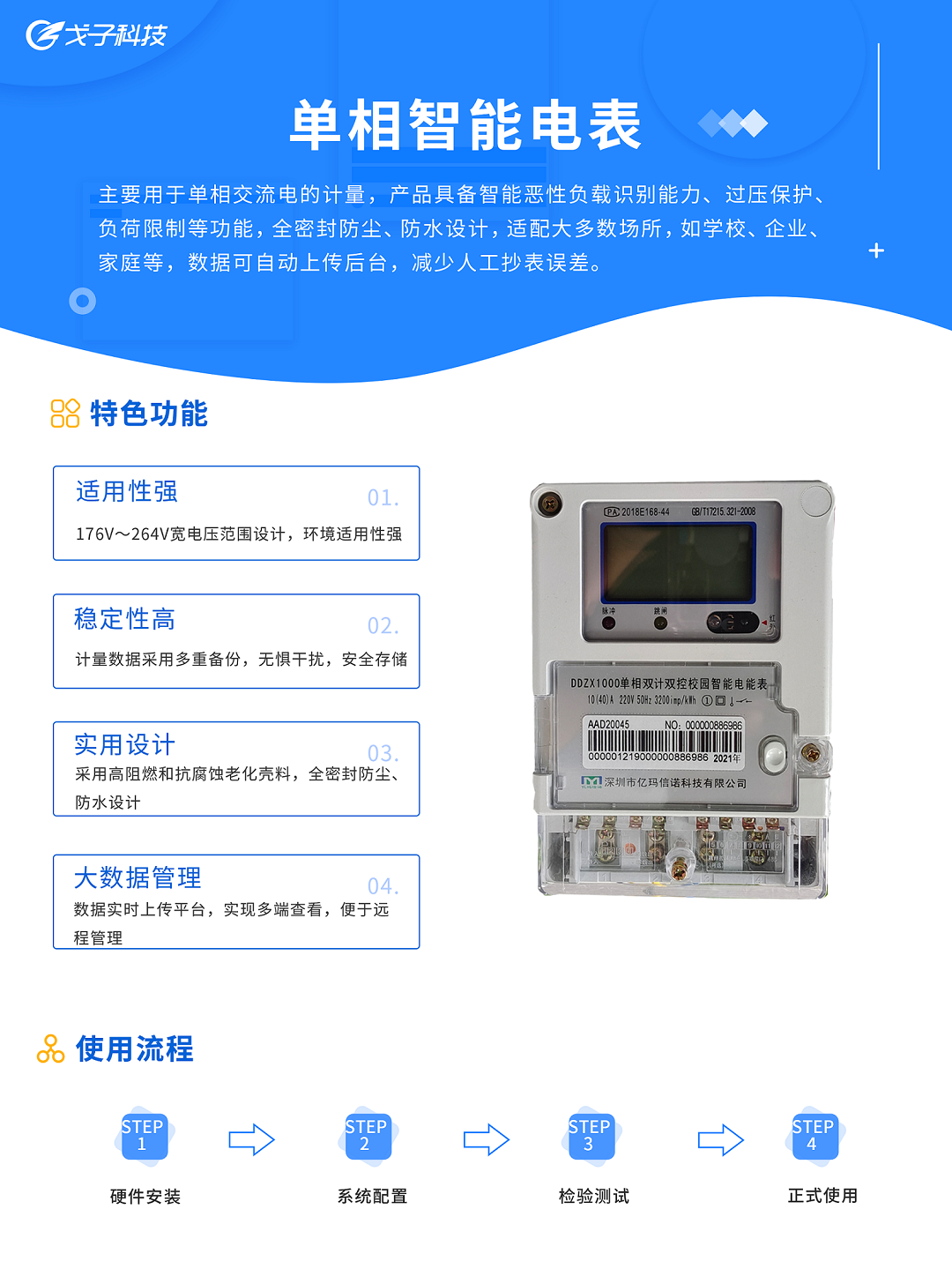 戈子科技单相智能电表主要用于单相交流电的计量,产品具备智能恶性负载识别能力、过压保护、负荷限制等功能,全密封防尘、防水设计,适配大多数场所,如学校、企业、家庭等,数据可自动上传后台,减少人工抄表误差。