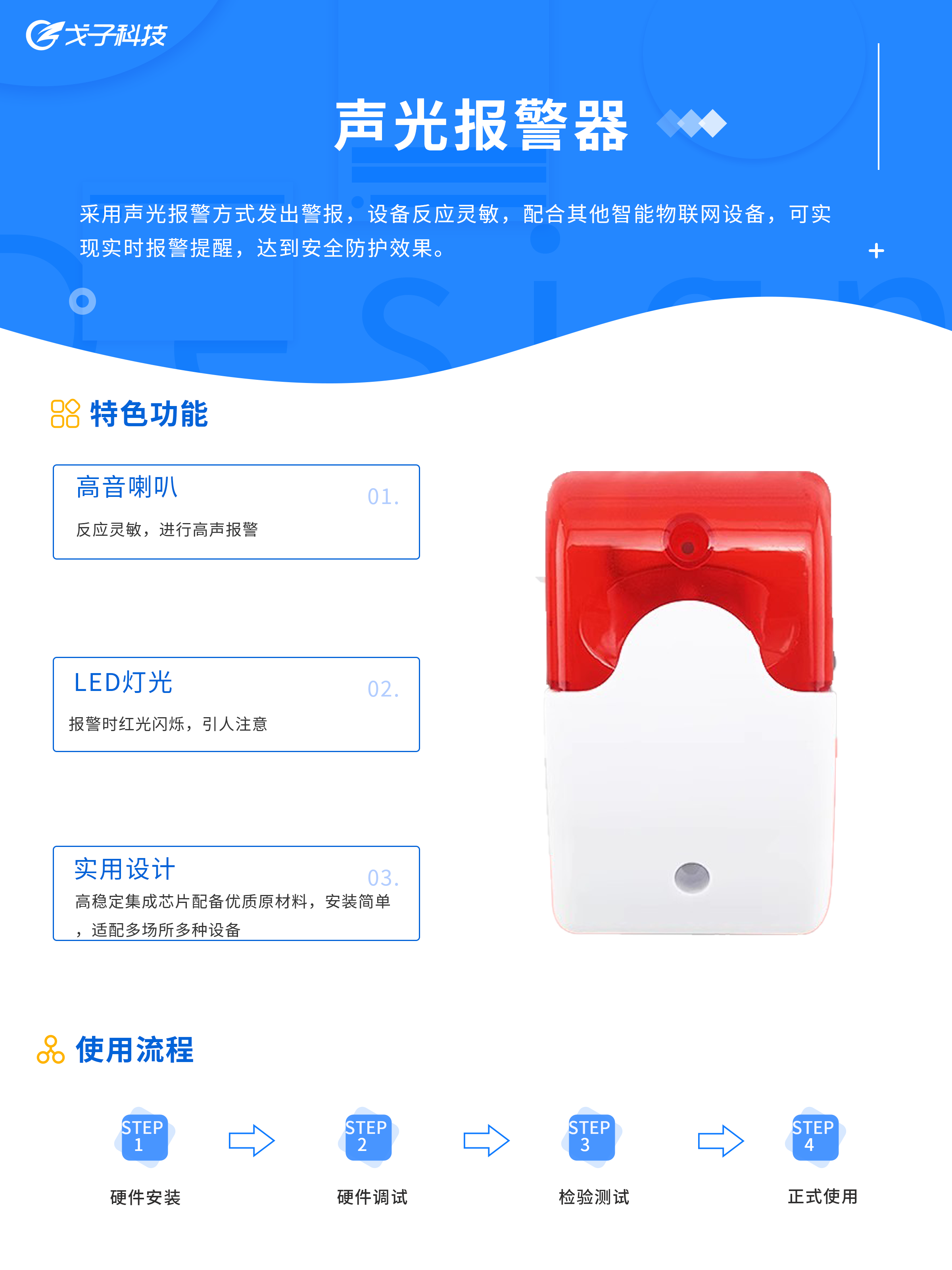 戈子科技声光报警器采用声光报警方式发出警报,设备反应灵敏,配合其他智能物联网设备,可实现实时报警提醒,达到安全防护效果。