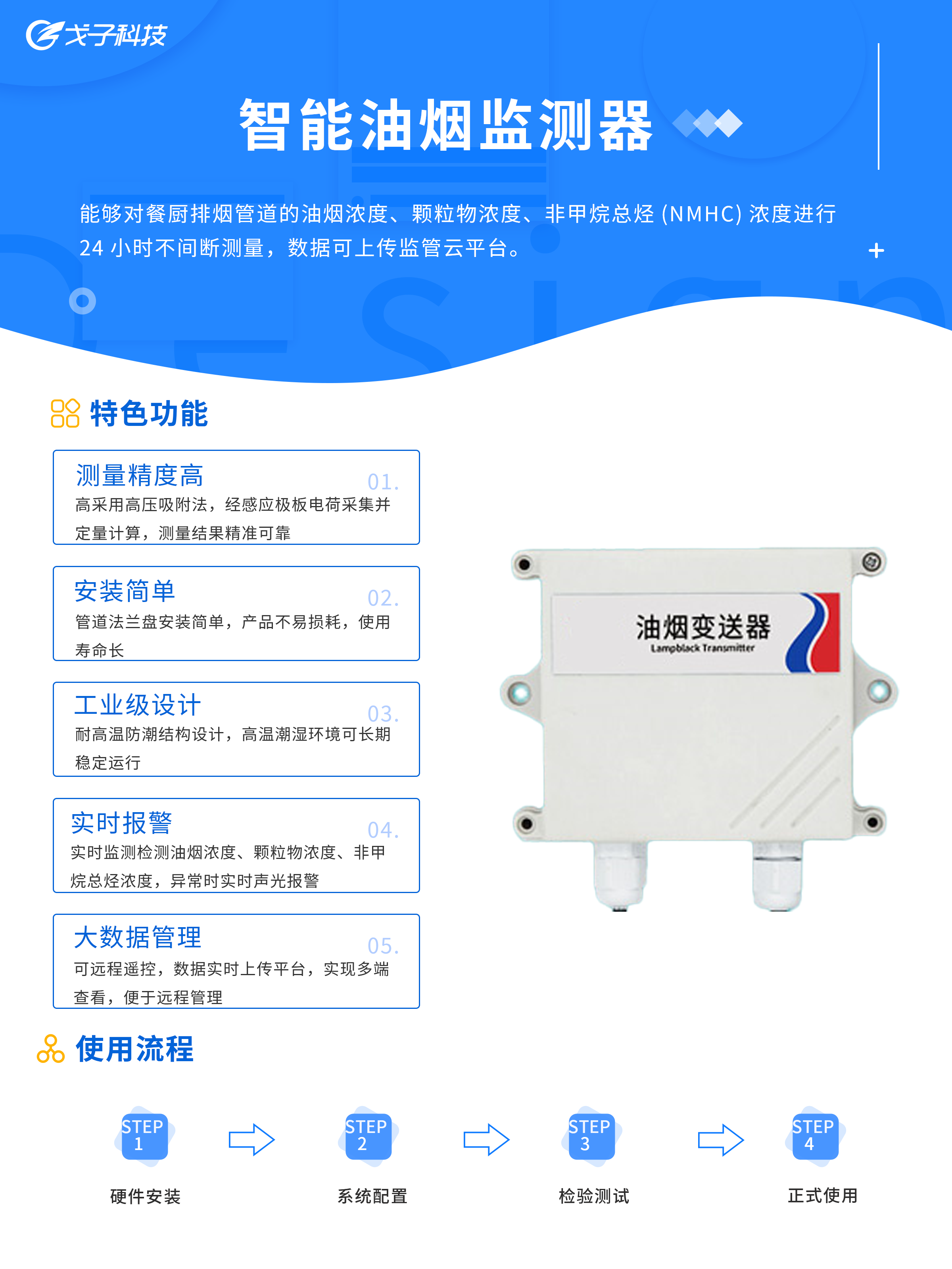 戈子科技智能油烟监测器能够对餐厨排烟管道的油烟浓度、颗粒物浓度、非甲烷总烃(NMHC)浓度进行24小时不间断测量,支持设置上限值,超限时自动声光报警。监测数据实时上传至监管云平台,可实现多端查看,便于远程管理。