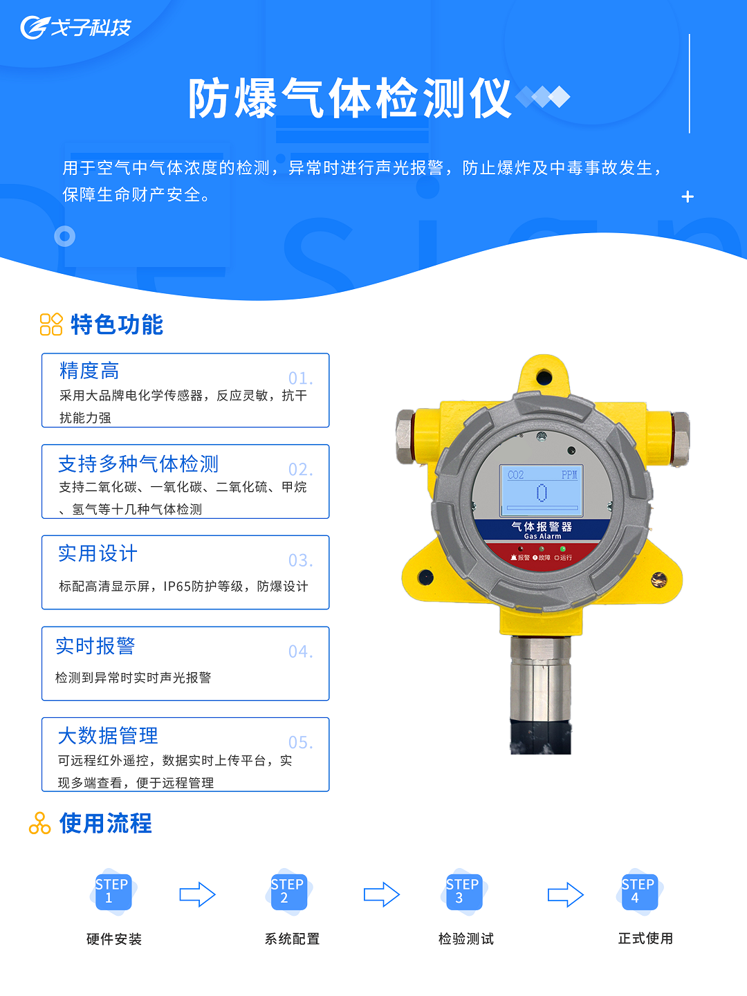 戈子科技防爆气体检测仪用于空气中气体浓度的检测,检测包含NH3、H2、CO(1000ppm)、CO(2000ppm)、H2S、CH4、NO2、SO2、O3、PH3、CH2O、CO、O2等气体。空气中气体异常时气体检测仪进行声光报警,防止爆炸及中毒事故发生,保障生命财产安全。