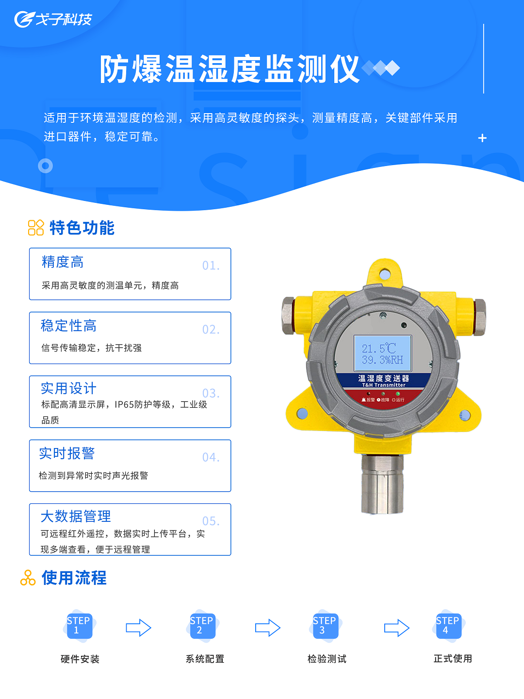 戈子科技防爆温湿度监测仪适用于环境温湿度的检测,采用高灵敏度的探头,测量精度高,关键部件采用进口器件,抗干扰能力强。配备高清显示屏,实时显示温湿度数值,检测到异常时实时声光报警。采用壁挂式防爆壳,安装方便,防护等级IP65,工业级品质,可应用于户外恶劣的现场环境。