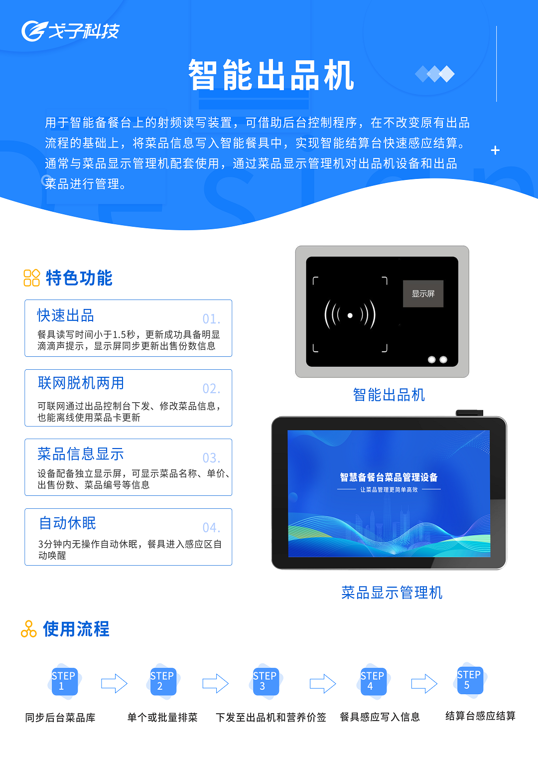 戈子科技智能出品机(嵌入式)是嵌入在智能备餐台上的射频读写装置,可借助后台控制程序,在不改变原有出品流程的基础上,将菜品信息写入智能餐具中,以实现智能结算台通过芯片感应写入的菜品信息进行快速结算。通过智能出品管控系统,可以统一餐盘颜色,减少餐盘分类分拣,减少后厨人员清洗工作量。