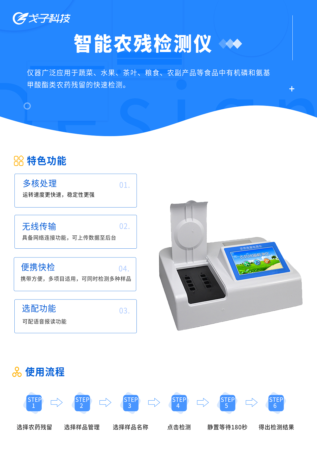戈子科技智能农残检测仪依据国家标准方法(GB/T5009.199-2003)以及世界卫生组织WHO、世界粮农组织FAO残留农药检测标准、世界环境保护局EPA参照摄入量等要求设计,采用酶抑制率比色法对水果、蔬菜等农林产品中有机磷和氨基甲酸酯类农药含量进行快速准确的检测。仪器广泛应用于主要用于蔬菜、水果、茶叶、粮食、农副产品等食品中有机磷和氨基甲酸酯类农药残留的快速检测;此外还可用于果蔬茶生产基地和农贸批发销售市场现场检测,餐馆、学校、食堂、家庭果蔬加工前的安全速测等。