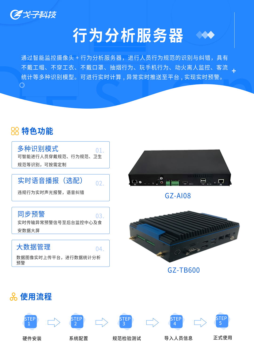 戈子科技行为分析系统通过智能监控摄像头+行为分析服务器,进行人员行为规范的识别与纠错,具有不戴工帽、不穿工衣、不戴口罩、抽烟行为、玩手机行为、动火离人监控、客流统计等多种识别模型。可进行实时计算,异常实时推送至平台,实现实时预警。
